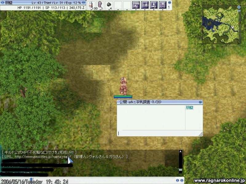 一応テストのつもりで上げておくけどきっと消さない。(爆笑) ていうかSS取れないと思ってたら取れてるじゃん!!orz 画像処理ソフトで開けばちゃんと見れるよばかちん!私のばかばかちん!!(泣) あと此れと同じのが、三枚。取ってありました。 当時の私の「えー!何でー!撮れないのかよこのポンコツPC!」ってなってたのがよーっく分かりますな。 つかもうこのPCでROやるのあと僅かなのに…もっと早く気が付けばよかったよ…!! 何かいっちばん突っ込みたいところあるし。 なんだ、浮気調査afkって ROしながらやるなよんなもん!! ていうか多分ネタだったんだろうけど…!! 笑えないよね。これ。 とりあえずブログの設定もちょっと変えて…注意書きも追加したりしなきゃ…。 てことでちゃんとしたのはまた後で…!!まだ色々やらなきゃだから…!!(泣) | !注目!